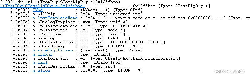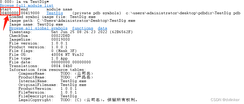 所以这个命令属于TestDlg模块,所以使用 lm命令查看TestDlg模块的初始地址: