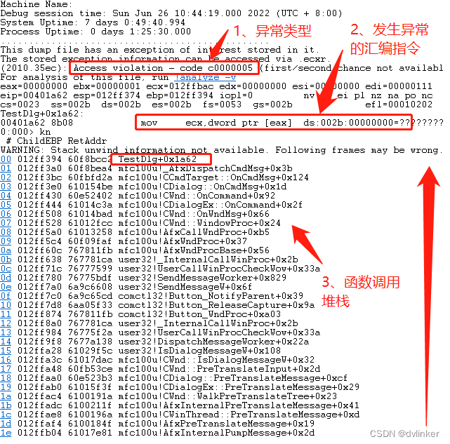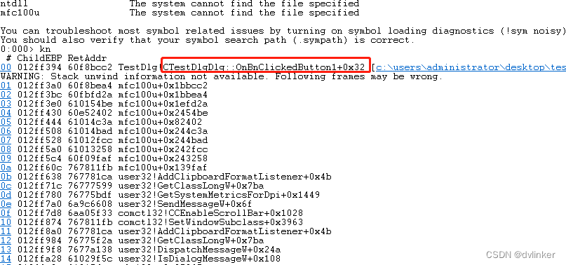 然后我们输入了k命令,打印出函数调用堆栈。函数调用堆栈从下到上看,上行是最后调用函数,它也是编译指令崩溃的函数。从函数调用堆栈的最后帧调用函数,程序崩溃发生在TestDlg文件模块中,不是其他DLL模块。显示的函数地址是测试Dlg文件模块的初始地址,为什么我不能在模块中看到特定的函数名称?这是因为Windbg无法找到与TestDlg有关的pdb文件,pdb文件包含相应的二进制文件中函数名称和变量的信息,将Windbg载入pdb文件以显示完整的函数名称.