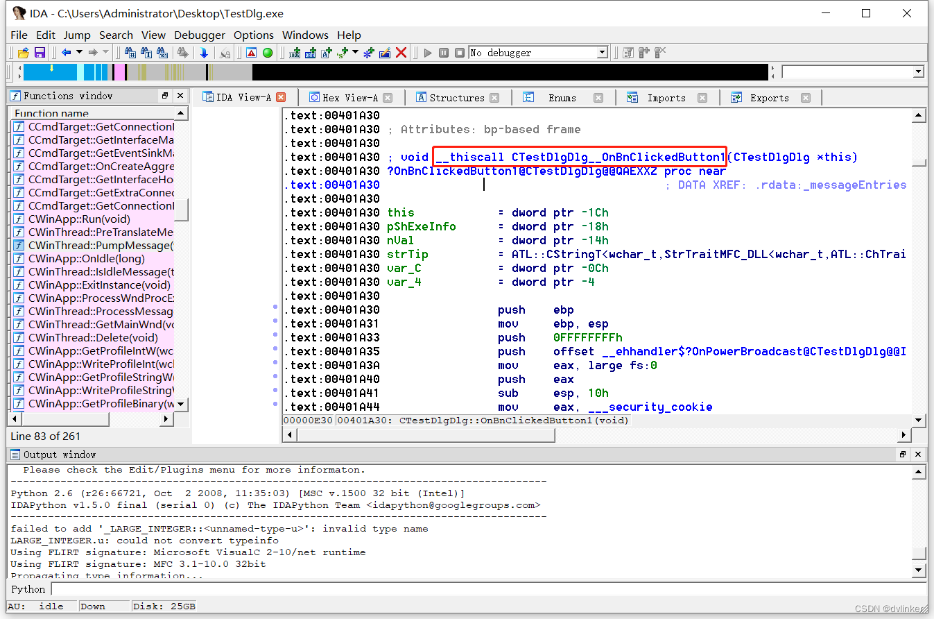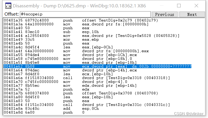 因此,基于先前计算的偏差,加上TestDlg模块的默认装载地址,异常指令的发生位于IDA打开的静态文件中: