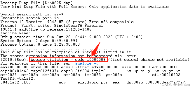 然后,看看发生异常的指令,看看指令的组成,以及在事故发生时的各个注册表的值,这可能对异常的原因作出初步估计。 如果命令访问一个非常小的地址或一个大的地址,它会触发记忆访问侵犯。