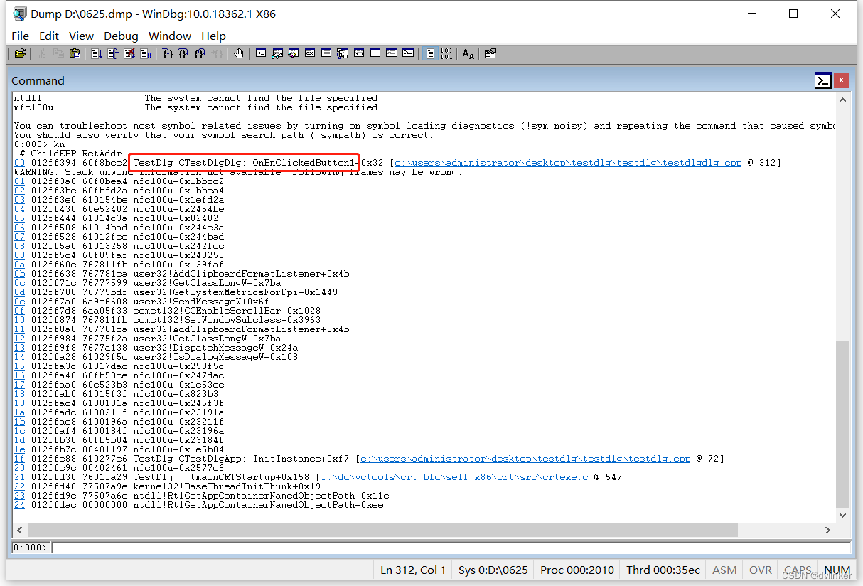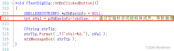 我们可以看到具体的函数名称CTestDlgDlg::OnBnClickedButton1和相应的代码行 312。 通过这些信息,我们可以在源代码中找到相应的位置,如下面所示:
