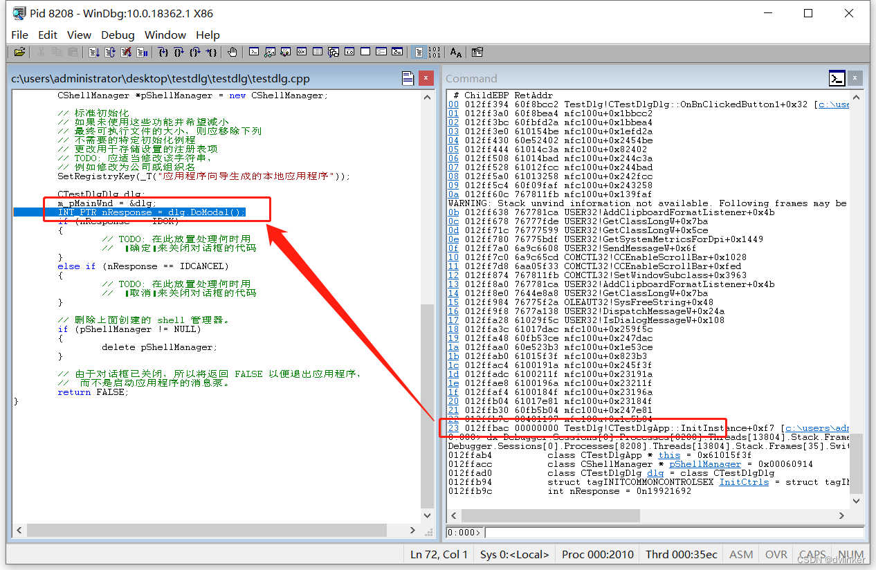点击OK按钮之前,最好选择“重载”选项,然后Windowsbg将自动下载pdb文件。但有时候选择是正确的,它似乎没有自动加载.我们需要使用它。 重载/f TestDlg命令迫使Windowsbg重载pdb文件(该命令必须包含包含文件末尾的文件的完整名称)。