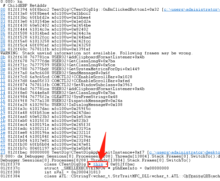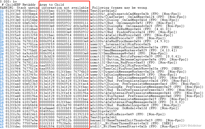 为了查看函数调用堆栈命令,除了k之外,还有kv和kp命令,kv还可以看到在函数调用堆栈中调用函数时传递的参数: