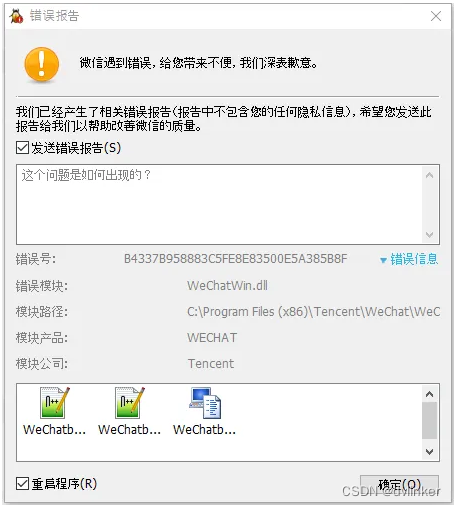 大多数软件都内置例外捕获模块,当软件崩溃时,相关的通知框会显示出来。例如,当WeChat的PC版本崩溃时,其内置例外捕获模块会捕获并生成日志和垃圾文件,并显示下列错误报告通知框: