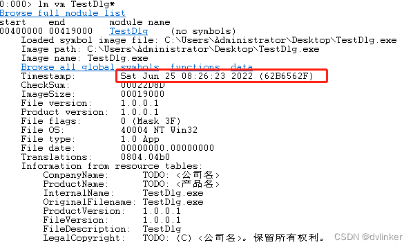 如何找到与TestDlg文件相对应的dpb文件?我们可以通过查看TestDlg文件的时间标记来找到该文件的编译时间,通过编译时间找到相应的pdb文件.在Windbg中,输入 lm vm TestDlg*命令,您可以查看TestDlg文件的详细信息,包含该文件的时标是:(使用当前lm命令中的m-符合参数,因此TestDlg的后面是*)