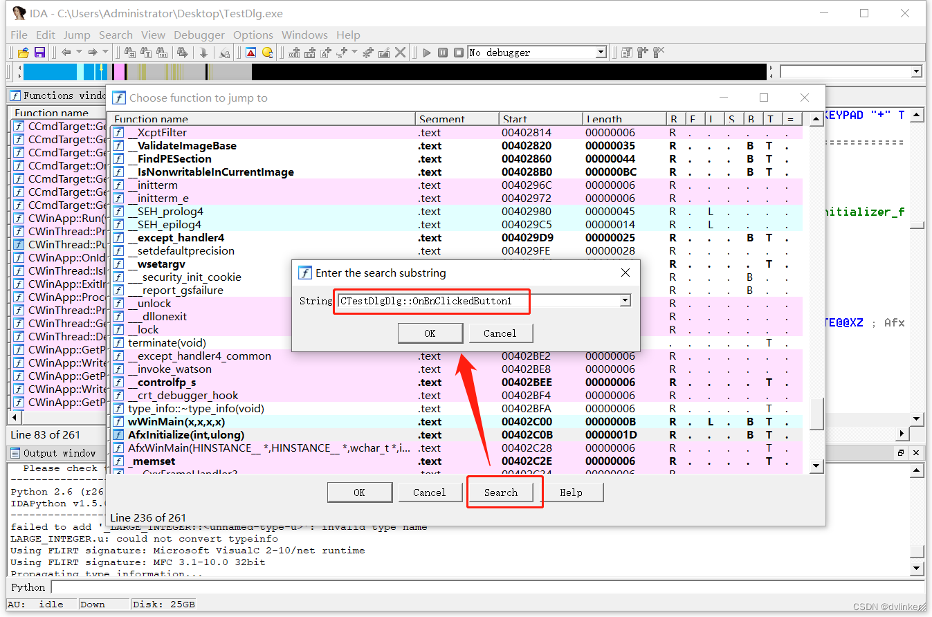 然后到IDA中,点击菜单栏的Jump->Jumptofunction...,在打开的函数列表窗口中,点击下方的Search按钮,在搜索框中输入函数名后搜索: