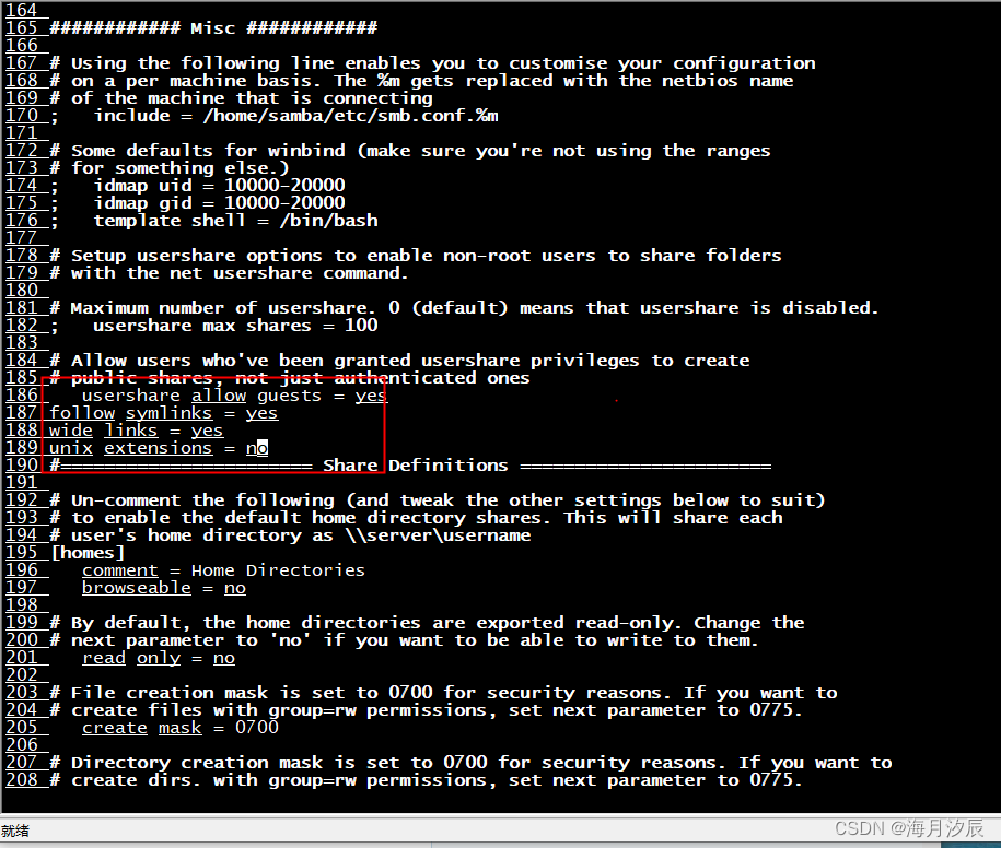 1, 编辑 sudo vi /etc/samba/smb. 在 conf 配置文件的“全球”节末, 添加下列三个设置: