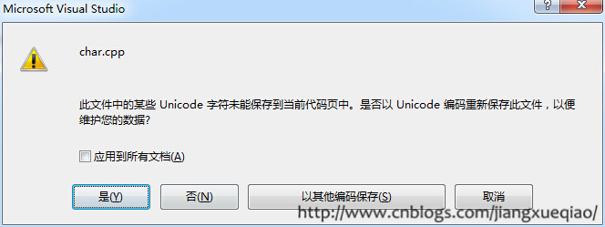 如果代码包含不支持GBK的字符,例如"rooster","? Visual Studio 将播放以下提示:
