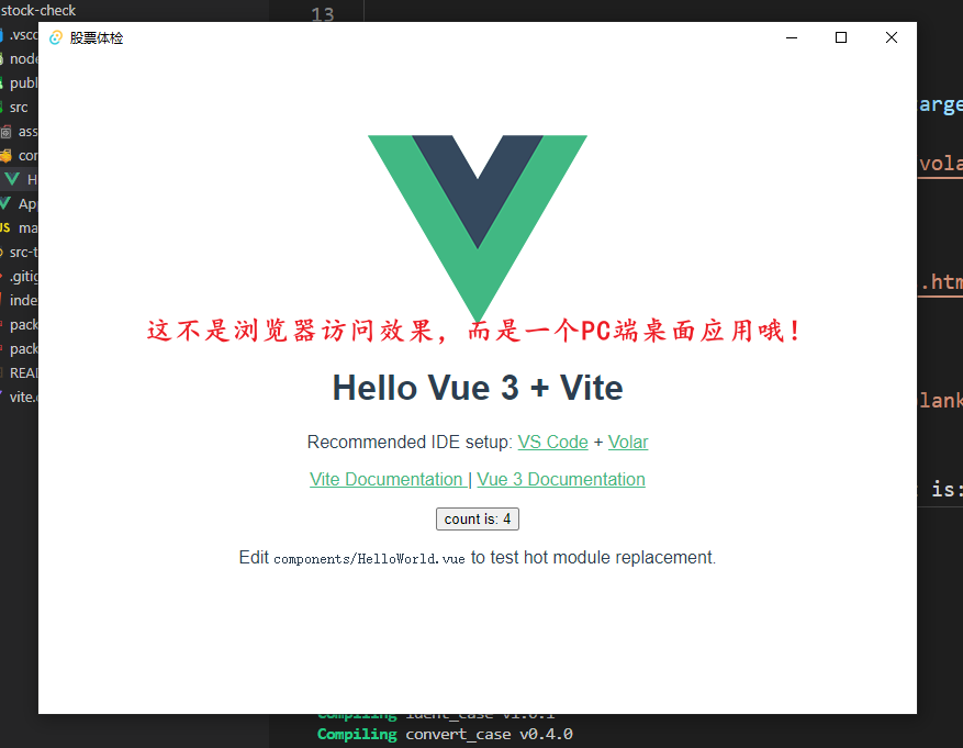 执行cd stock-check进入项目目录并执行npm run tauri dev运行项目,运行后可以在浏览器上查看,也可以视作窗口桌面软件。 但是作者的实验中,进入项目目录后,npm run tauri dev还有另外一个命令要执行npm install介绍一些由前端开发者使用的Js依赖模块。 桌面端应用程序运行并开始如下: