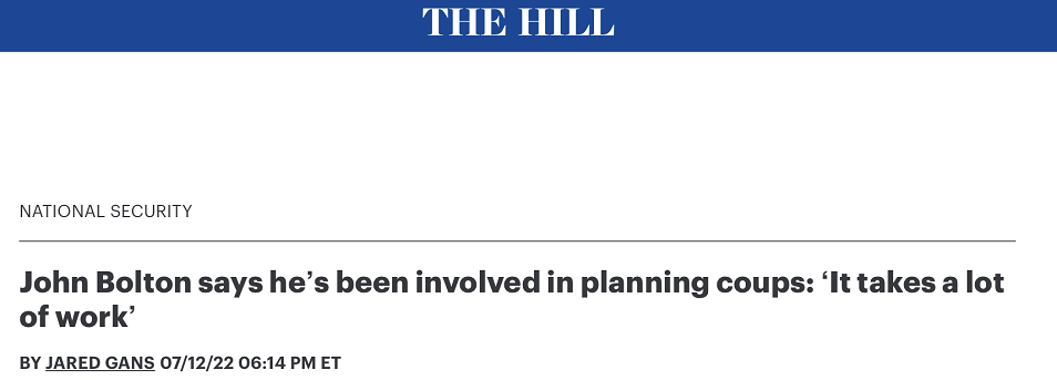 博尔顿说:“作为帮助策划政变的人 — — 不是在这里(美国),而是在其他地方 — — (我知道)需要很多工作,而他(特朗普)却没有。”