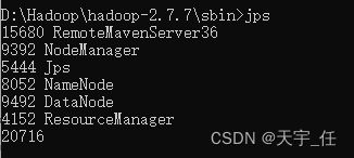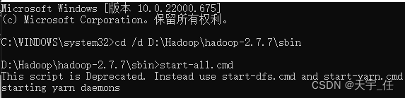 作为管理员打开CMD并切换到D:Hadoophadoop-2.7.7sbin目录下,输入命令:start-all.cmd