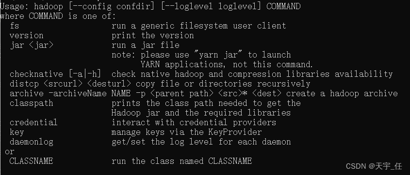 打开 cmd, 输入 hadoop, 如果下列图片出现, 则成功配置