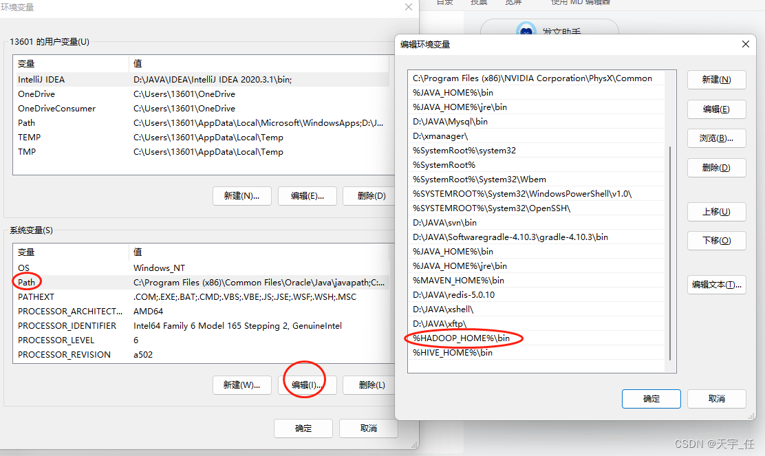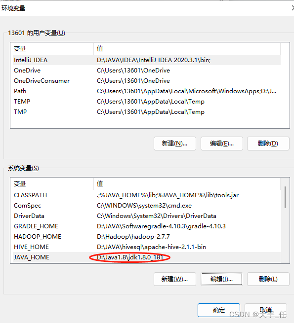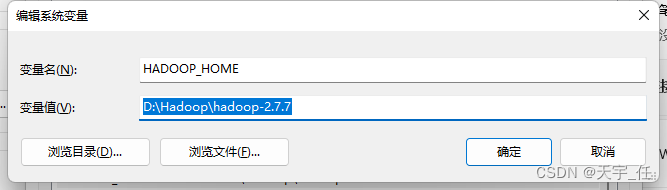 变量值: D:Hadoophadoop-2.7.7(填入个人解压缩目录)