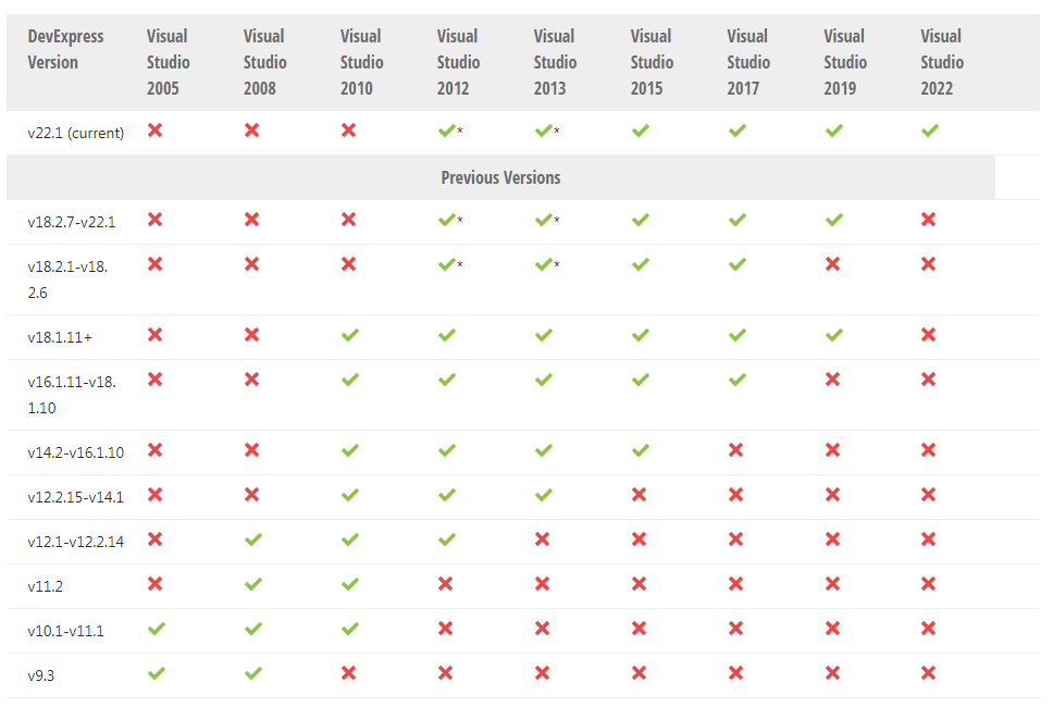 下面的表显示了由DevExpress WPF控件支持的Visual Studio版本。