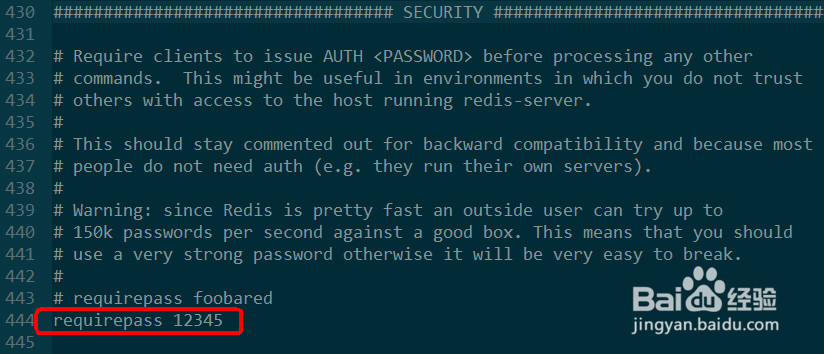 找到包含Requirepass模式的地点,添加一个行,并输入Requirepass 12345。