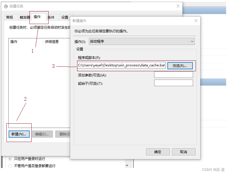 选择操作创建新的操作启动程序选项选择.bat文件位置。