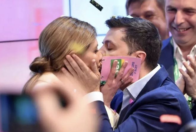当泽拉扬斯基当选总统时,他在现场亲吻妻子