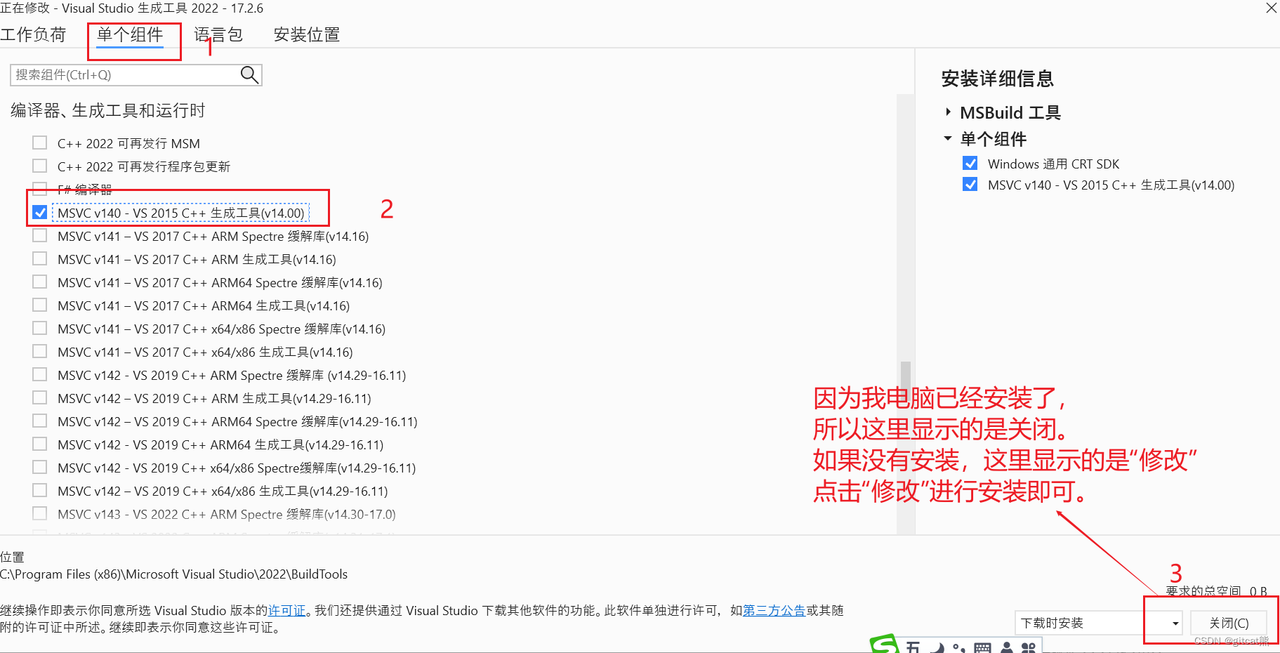 然后我们单击上图中的“修改”进入下页,然后执行以下步骤安装MSVC v140,它将安装C++编译器。