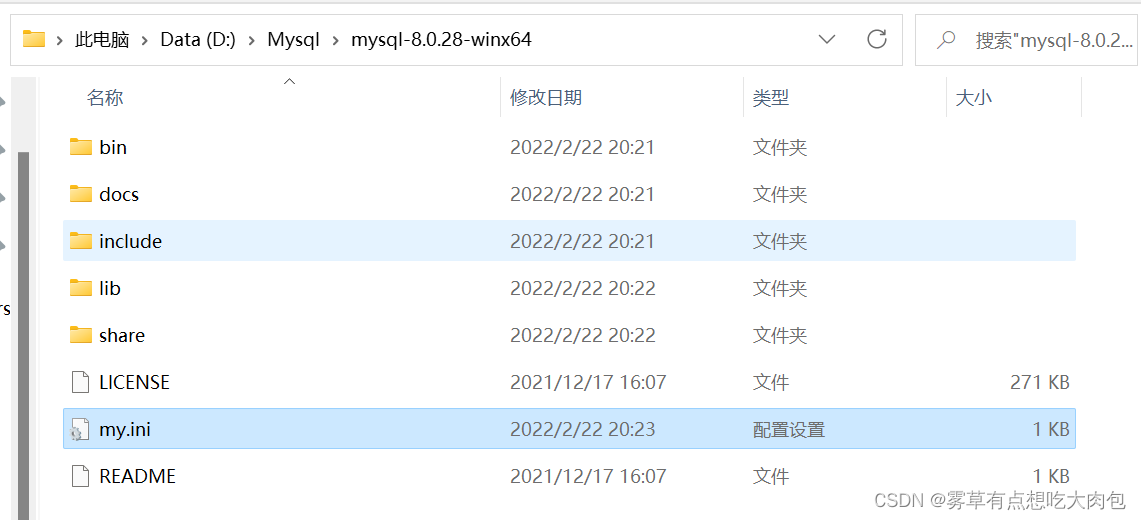 创建my.ini配置文件,因为下面会有控制台创建data文件,所以在这里不要自己创建data文件夹,不要自己创建data文件夹,不要自己创建data文件夹!!!重要的事情说三遍。