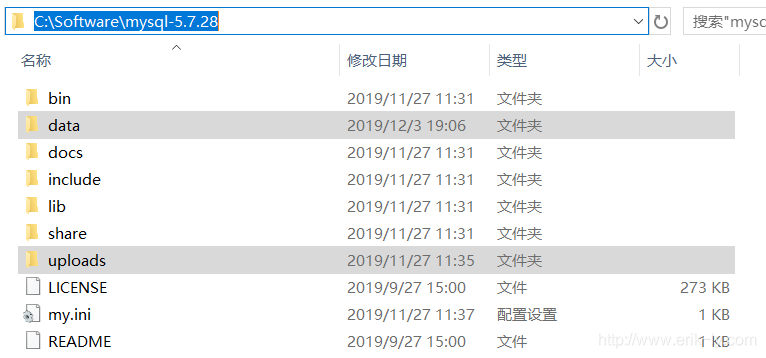 在C:Softwaremysql-5.7.28目录中分别创建data和uploads存储MySQL数据的文件夹,并导入和输出文件。