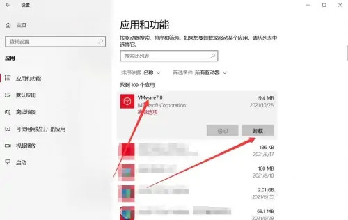 在应用程序管理接口软件列表中找到VMware,然后单击“卸载”按钮。