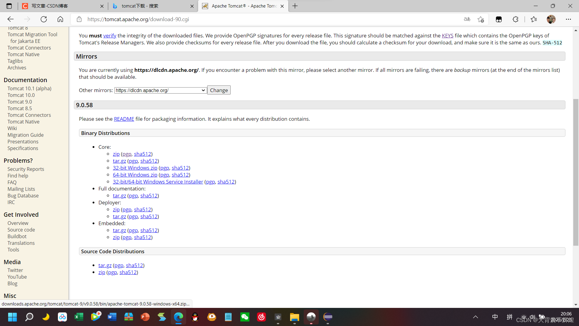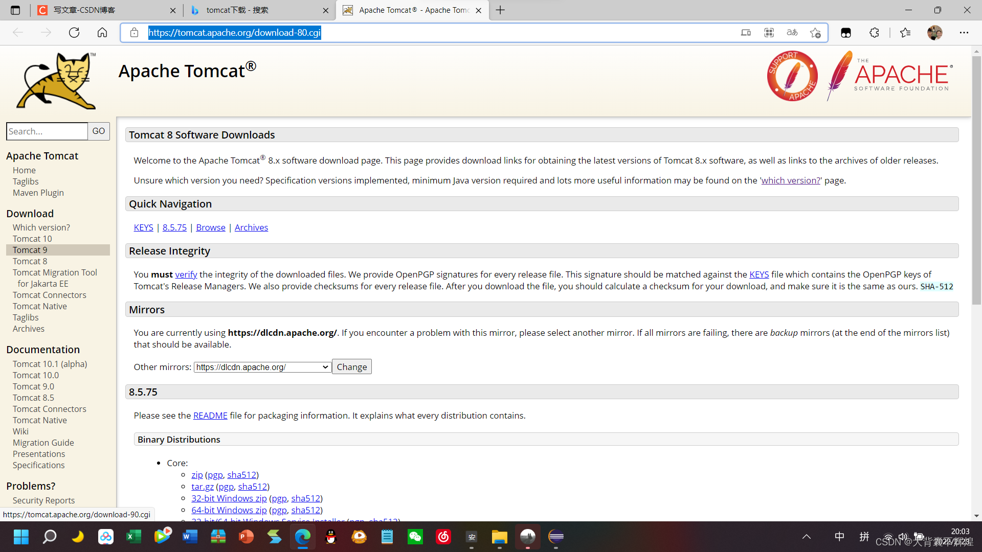 ,找到左侧中的Download找到对应版本的tomcat(我下载的是tomcat9)。