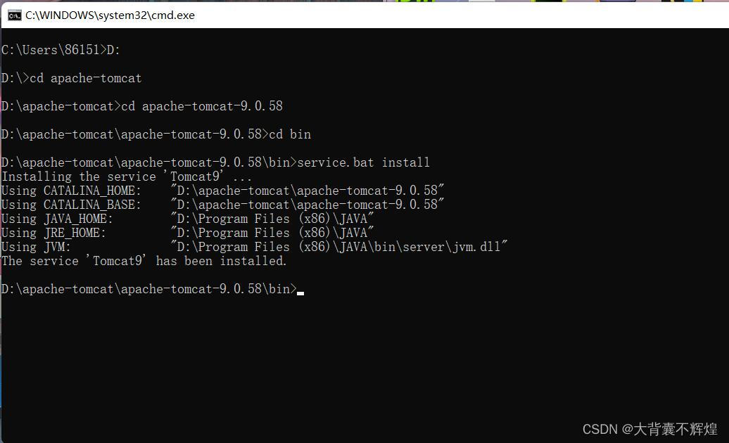 2.通过Windows服务安装Tomcat并打开命令提示以运行 service.bat batting脚本service.bat install,详细操作如下所示。(出现has been installed即代表安装成功)