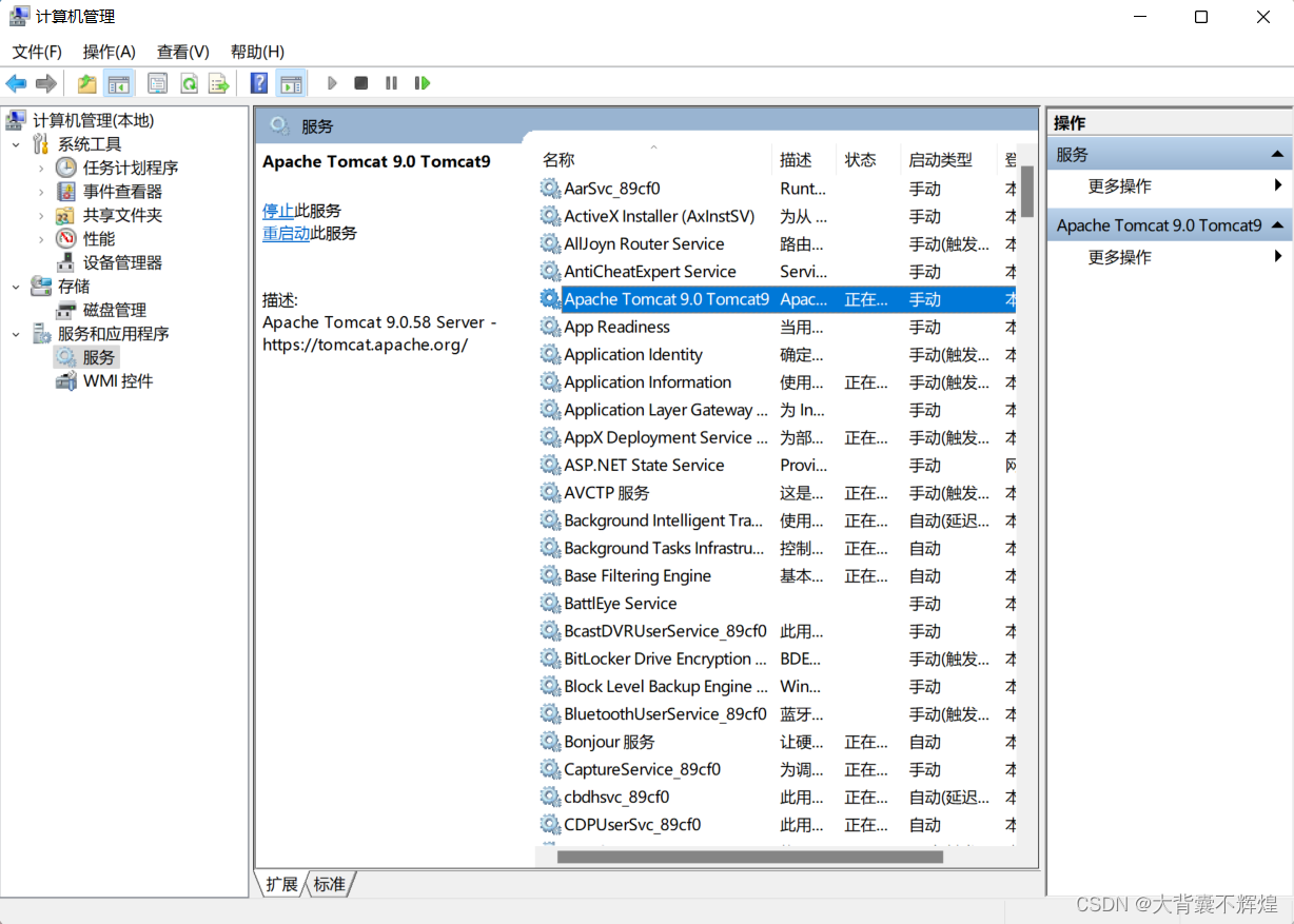 右键点击桌面上的“此电脑”->“管理”->“服务和应用程序”->“服务”,找到“Apache Tomcat 9.0Tomcat9”服务,右键点击该服务,选择“启动”。