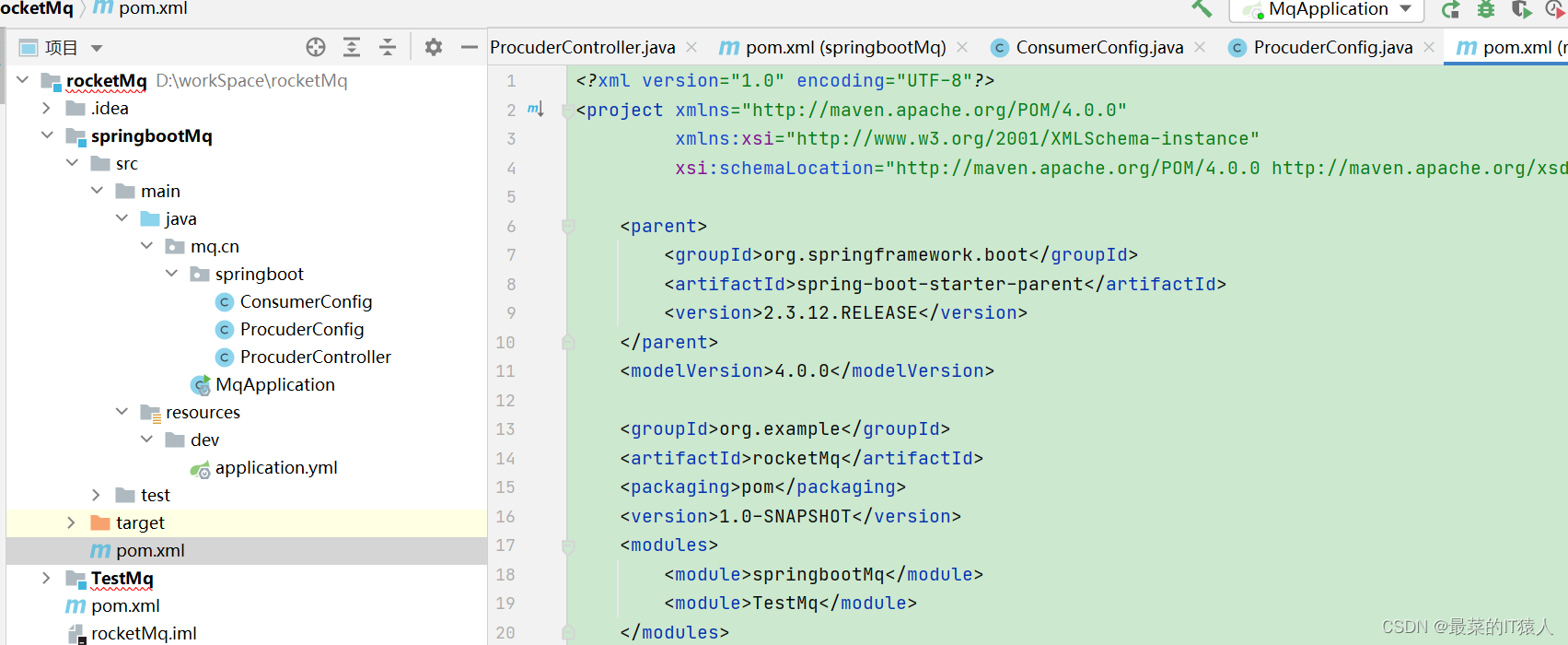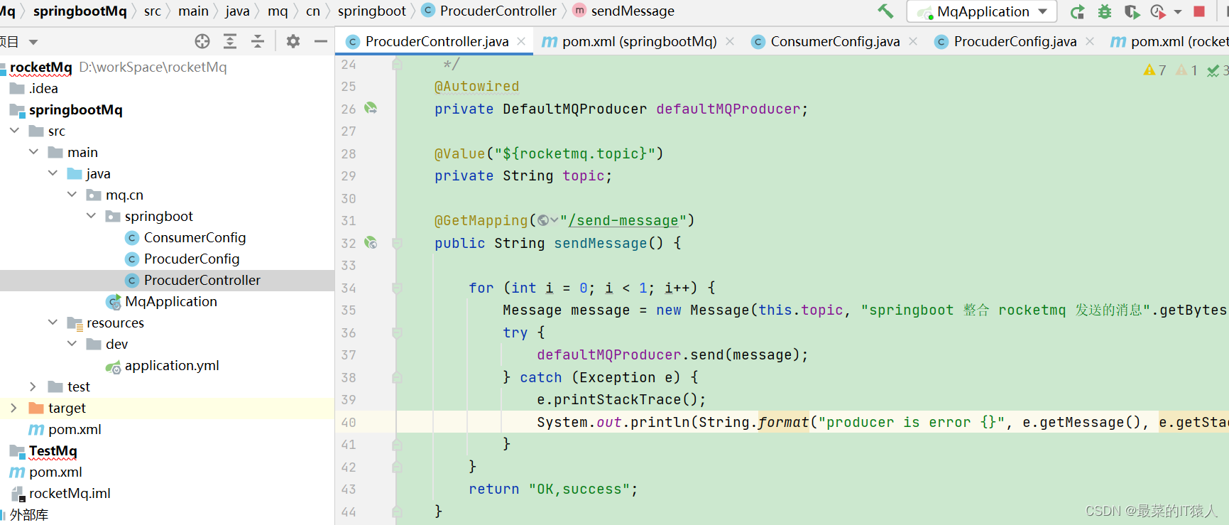 - 不能发一次消息,换一次 group ,因此 DefaultMQProducer 需要注入 ,主要作用是说明 procuder 的身份