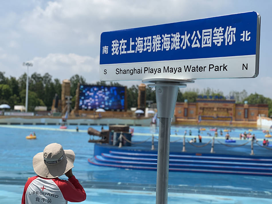 水上公园的路标上写着:“我在上海的玛雅海滩水上公园等你”