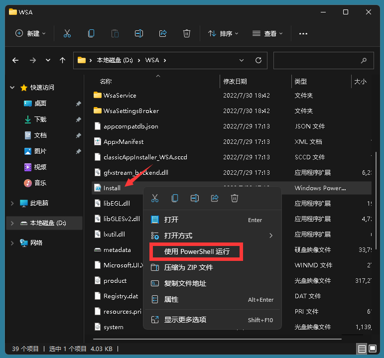输入WSA文件夹,找到安装文件,右击它,然后选择运行PowerShell