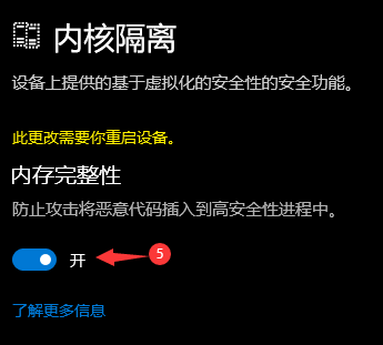 依次点击:隐私和安全性—>Windows安全中心—>设备安全性—>内核隔离(内核隔离详细信息)—>内核完整性(开启)打开电脑后重新启动