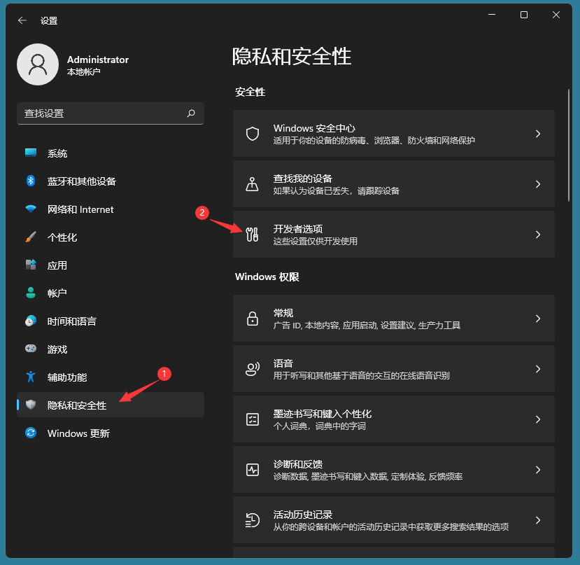 依次点击:隐私和安全性—>开发者选项—>开发人员模式,将此选项打开