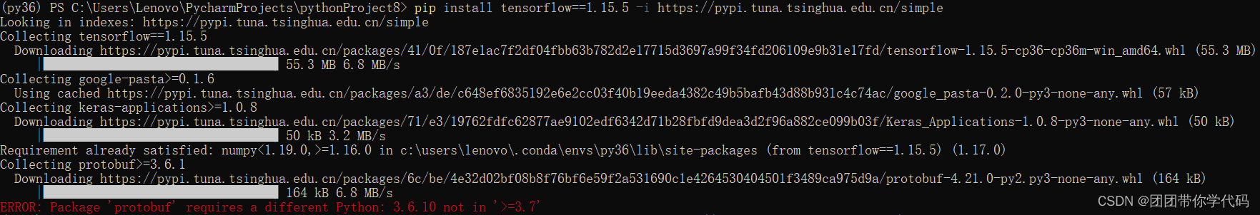 将Python降级为3.After6,我想安装Tensorflow 1.15。没想到还是出错了,提示 Package 'protobuf' requires a different Python: 3.6.10 not in '>=3.7',他们让我升级我的Python到3.7,这叫什么事啊。