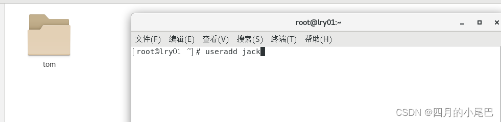 比如我这里在home目录下就有一个tom目录,这是我之前自己创建的一个用户。可以再创建新的用户,步骤如下:桌面右键打开终端>输入useradd jack