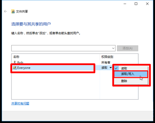 3. 右键单击要共享的文件夹,然后选择共享、一个特定用户、输入字段中的每一个人键入输入字段,然后单击添加,最后单击完整。