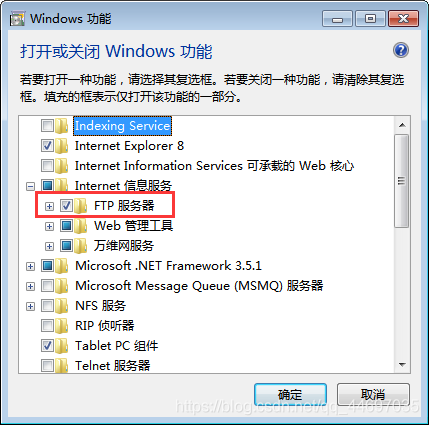 定位 Internet 信息服务, 并检查“ FTP Service”、“ FTP 扩展” 和“ IIS 管理控制台” 旁边的框, 然后单击“ 确定 ” 。