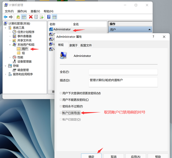 打开 " 计算机管理 ",选择本地用户和组,然后单击 " 本地用户和组 -- -- 用户 " 。右侧,您可以看到 管理员用户,双击,取消“ 账户已停止使用” 对话框,单击 OK,取消当前用户,看到 署长用户出现,然后单击行政账户。