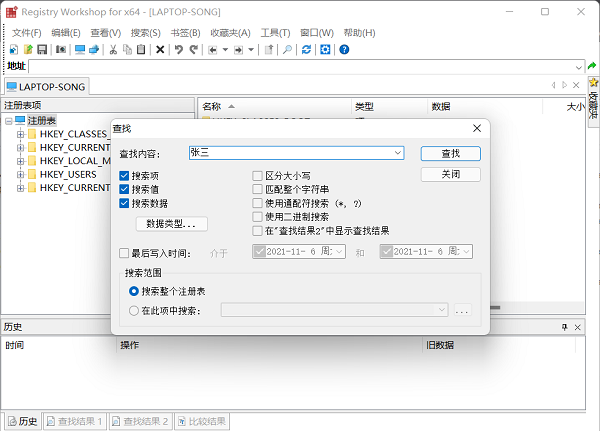 打开RegWorkshop, 进行搜索, 在搜索中输入原始用户名, 并点击搜索按钮 。