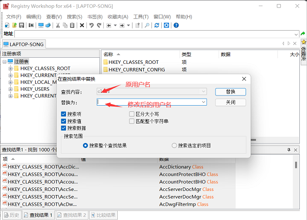 查找许多结果,选择结果中的全部 Ctrl+A,右键单击以替换文本框中新修改的用户名,单击以替换。