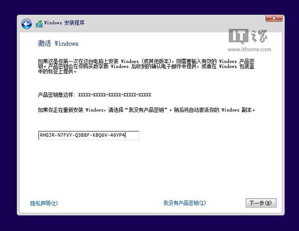 您可以在此使用已安装的密钥 RHGJR- N7FVY- Q3B8F- KBQ6V-46YP4( 仅限专业版本, 无效), 点击 " 下一步 " 进行输入; 点击 " 跳过 ", 安装完成后输入激活代码, 跳过后选择安装版本 。