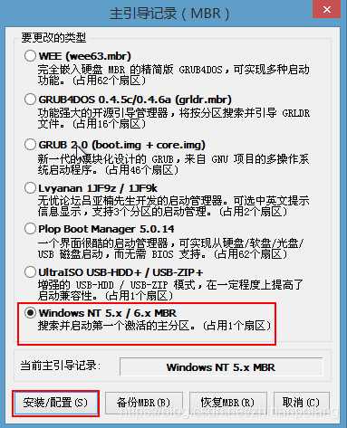 四,我们在弹出框中选择“窗口NT5”。x/6.x MBR,然后在底部选择“安装/配置”。