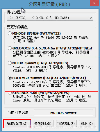 七. 如果赢7的用户点击 " Bootmgr试点 ",xp用户点击 " NTLDR试点 ",最终点击弹跳窗口中的 " 安装/配置 " 。