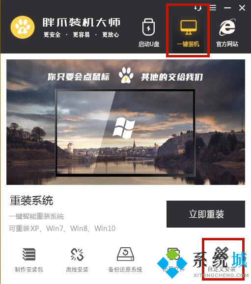 2.安装完成后运行胖爪装机大师软件,进入右上角的“一键装机”窗口,并在下方找到“自定义安装”功能进入;