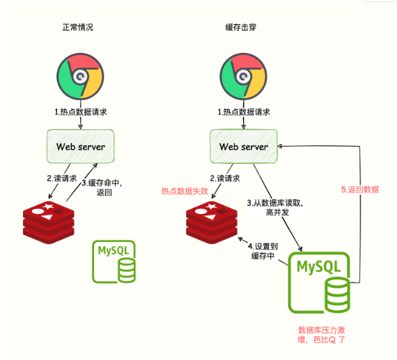 - ** 缓冲爆炸(故障)** 是指数据库中的数据,这些数据也应在缓存中,但缓存过期,交通屏蔽Redis被打破,要求直接访问数据库。