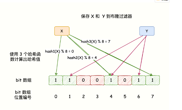 在添加项目时,使用 k 不同的散列函数进行计算,然后将元素散列图的所有 K 位置设置为 1 。