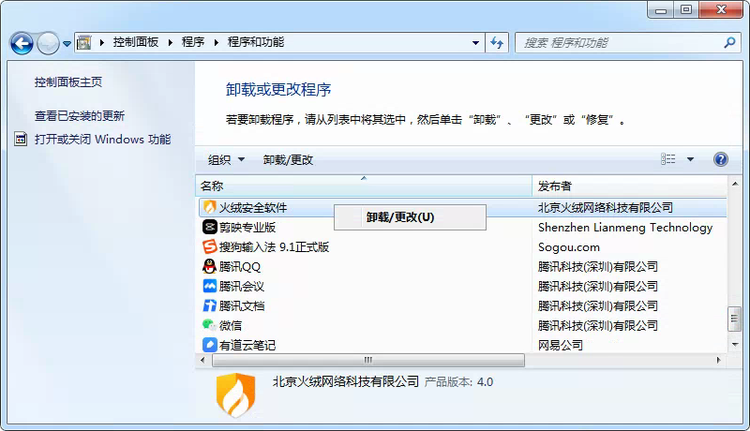 第2步 打开控制面板 - 程序 - 卸载应用程序, 定位“ 火焰安全软件 ”, 右键单击“ 卸载 ”, 详情如下: